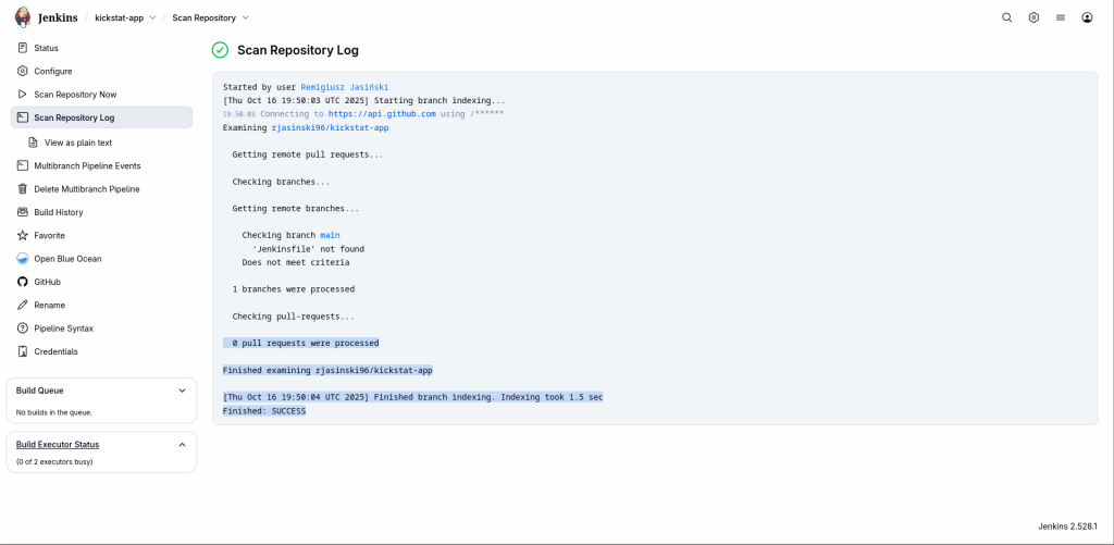 w ten sposób uruchomiliśmy serwer Jenkinsa w Dockerze za Ngrok reverse proxy ze statycznym adresem domeny. Przeprowadziliśmy autentykacje Jenkinsa z GitHub API przy pomocy Personal access token i utworzyliśmy projekt typu Multibranch Pipeline z kodem źródłowym repozytorium. W następnym wpisie wdrożę prostą aplikację React gdzie napiszemy Pipeline i skorzystamy z Webhooka w reakcji na zdarzenia z konkretnych branchy tak żeby pokazać ci jak może to wyglądać w praktyce